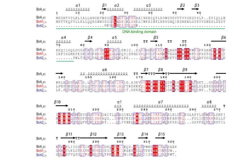 在益生菌乳酸球菌中,利用冗余基因破译一种独特的生物素,BPL被分为两组:I组BPL缺乏N端DNA结合基序,而II组BPL(BirAs)具有N端DNA结合域。范式II组BPL是大肠杆菌BirA,此类酶也存在于古菌中,表明II组版本可能是BPL酶家族的祖先。基于注释,乳酸乳球菌IL1403可能拥有两种类型的BPL,此处称为BirA1_LL(323个残基,推定的II组BPL)和BirA2_LL(250个氨基酸,推定的I组BPL)。两个BirA蛋白的多序列比对显示,它们与大肠杆菌BirA相比,具有20.7%的同一性和34.6%的相似性(图2)。