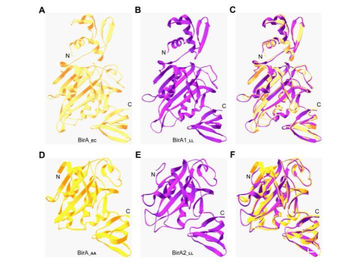 图4.乳酸乳杆菌两种BirA同源蛋白的结构解析。大肠杆菌BirA结构(图A)与乳酸乳杆菌BirA1(BirA1_LL)的建模结构(图B)具有高度结构相似性。(C)BirA1_LL与BirA_EC的结构叠加对比。BirA_EC结构(PDB:1HXD)以黄色标注,而与BirA_EC结构同源性达28.6%的BirA1_LL结构则以紫色呈现。(D)嗜热栖热菌BirA蛋白(BirA_AA)的整体结构视图,以及以BirA_AA为模板建模的BirA2_LL蛋白(图E/F)结构叠加对比。BirA_AA结构(PDB:3EFS)以金色标示,而以BirA_AA为模板、同源性达32.4%的BirA2_LL建模结构则以紫色高亮显示。标注说明:AA代表嗜热栖热菌;LL代表乳酸乳杆菌;N表示N端;C表示C端。