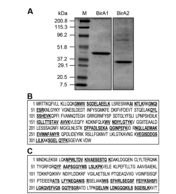 图3.乳酸乳球菌BirA1和BirA2蛋白的纯化及质谱鉴定。(A)两种纯化BirA蛋白(BirA1和BirA2)的12%SDS-PAGE电泳图谱。首条泳道使用预染色蛋白标准品(M),图左侧标注了各分子量单位(kDa)。通过液相色谱四极杆飞行时间质谱验证两种重组蛋白BirA1(图B)和BirA2(图C)的鉴定结果。与数据库序列匹配的肽段片段以加粗下划线形式标注。BirA1的覆盖率为36.8%,BirA2的覆盖率为45.6%。