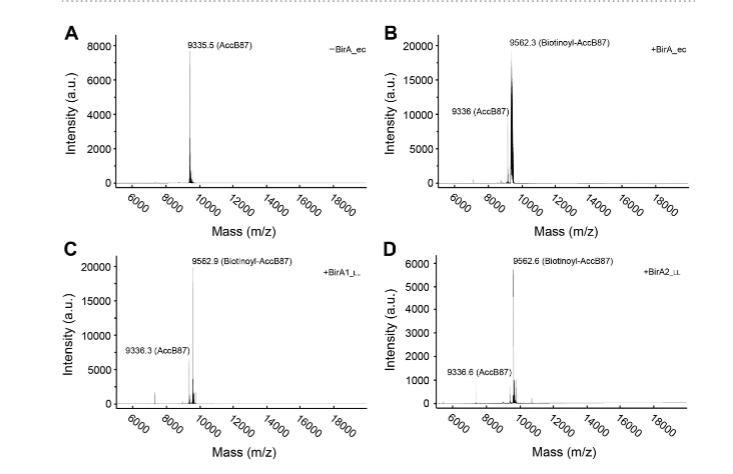 这意味着在测试条件下,BirA_ec是三个BPL酶中最活跃的版本。使用MALDI-TOF直接测量由生物素化引起的AccB87质量变化,如先前所述。在我们的测定中,AccB87的质量计算为9335.5~9336.6(图7A),生物素酰-AccB87的质量确定为9562.3~9562.9(图7B-D)。总之,数据说明:1)乳酸乳球菌两种版本的BirA(BirA1_LL和BirA2_LL)作为BPLs功能较弱;2)BirA2_LL相对于BirA1_LL更具催化活性。