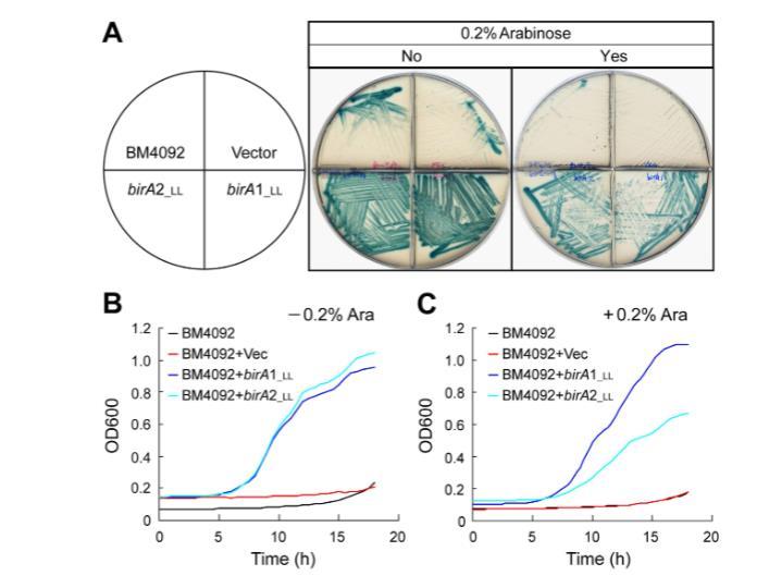 BPL活性使用充分研究的大肠杆菌模型和体外酶测定进行测量。用于功能互补birA同源物的模型大肠杆菌菌株是birA1突变体BM4092,它缺乏合成生物素或高亲和力转运生物素的能力2?。正如预期,BM4092菌株无论带有或不带空载体pBAD24,在补充25 nM生物素的M9琼脂平板上均不生长(图5A)。相反,阿拉伯糖诱导表达(甚至基础表达)的birA1_LL和birA2_LL均支持BM4092在非允许生物素水平(25 nM)下生长(图5A)。
