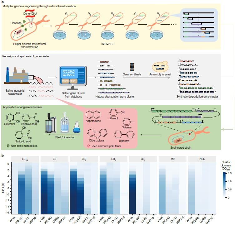 工业废水、石油污染和塑料污染因其毒性、致突变性和持久性而成为全球海洋生物安全的重大威胁1。微生物在生物修复中的使用受到有机污染物复杂性和对盐水胁迫的有限耐受性的限制。在这项研究中,研究人员使用了合成生物学将Vibrio natriegens改造成一种能够生物修复盐废水和土壤中复杂有机污染物的菌株。能力主调节基因tfoX入V的1号染色体中。natriegens菌株Vmax并过表达以增强DNA摄取和整合。降解基因簇在酵母中化学合成和组装。开发了一种基因组工程方法(基于Vmax的迭代自然转化,具有扩增的tfoX效应)将五个基因簇(总共43 kb)转移到Vmax中。该工程菌株能够生物修复氯碱厂和炼油厂的工业废水样品中的五种有机污染物(联苯、苯酚、萘、二苯并呋喃和甲苯),涵盖从单环化合物到多环化合物的广泛底物范围。