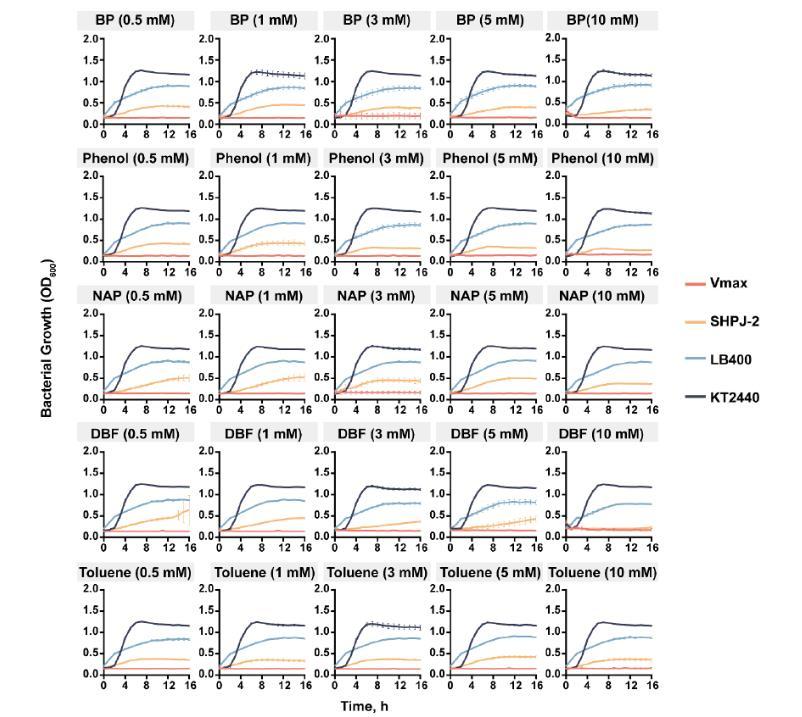 图3、不同菌株(Vmax、SHPJ-2、LB400和KT2440)在含有联苯(BP)、苯酚、萘(NAP)、二苯并呋喃(DBF)和甲苯的LB1/4培养基中生长曲线。所有菌株在30℃下培养。芳香污染物浓度梯度设置为:0.5 mM、1 mM、3 mM、5 mM、10 mM。统计分析:数据用3个生物重复的平均值±SD表示。