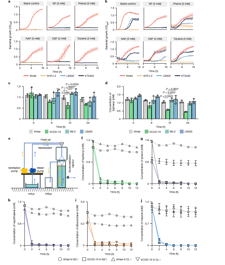 图5、VCOD-15对活性污泥生物反应器中复杂污染工业废水样品的生物修复。a)钠工业废水样品中的Vmax、鞘氨醇单胞菌属SHPJ-2、B.xenovorans LB400和P.putida KT2440的生长曲线,测量为OD600。菌株在废水样品BZ I(a)和DL I(b)中培养,加入10 g l-1酵母提取物和相应浓度的污染物(如面板上方的灰色条所示)在30°C下振荡。c,d)菌株的联苯修复效率Vmax菌株、VCOD-15菌株、P.putida B6-2菌株和工业废水样品BZ I(c)和DL I(d)中的B.xenovorans LB400(c)和DL I(d)e)用于修复工业废水样品中复杂有机污染物的活性污泥生物反应器示意图。f–j,复杂有机污染物。f,联苯;g,苯酚;h,萘;i,二苯并呋喃;J,甲苯)在工业废水样品中VCOD-15的修复效率,在e中所示的活性污泥生物反应器中进行。统计分析:数据表示为三个生物学一式三份的平均值±s.d.(a,b)。数据表示为三个独立实验(c,d)的平均值±s.d.。使用单因素方差分析(ANOVA)和Tukey多重比较检验评估统计显著性。数据表示为s.d.(f-j)三个生物学一式三份±平均值。