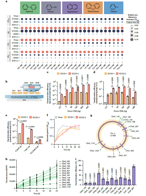 图2、a)含有污染物(分别为联苯、苯酚、萘、DBF和甲苯)的LB1/4、LB、LB3和LB5培养基中的候选菌株生长速率。气泡大小表示最大生物量(OD600)与培养时间(h)的比率。b)描述tfoX插入安排的示意图。将lac纵子插入V的int位点。纳特里根ATCC 14048生成V。纳特里根Vmax的。受诱导型启动子PT7调控的tfoX基因插入chr的int位点。Vmax的1个,DdRp的下游和rsmE的上游。c)使用0.5–400 ng p15A质粒进行自然转化的VCOD-2转化测定。d)使用染色体中0.5–400 ngΔwbfF::CmR(3 kb/3 kb)供体DNA进行VCOD-2转化测定,自然转化。e)使用5 ngΔwbfF::CmR供体DNA进行VCOD-2转化测定,该供体DNA含有指定的自然转化同源侧翼。f)菌株Vmax、VCOD-1和VCOD-2在LB3培养基中的生长,以OD600测量。g)选择作为CHR上候选插入位点的12个中性位点的分布。Vmax的2。h)通过自然转化插入12个位点的表达sfGFP的细胞的荧光。i,使用2 kb侧翼同源片段和sfgfp供体DNA表征12个位点的重组效率。