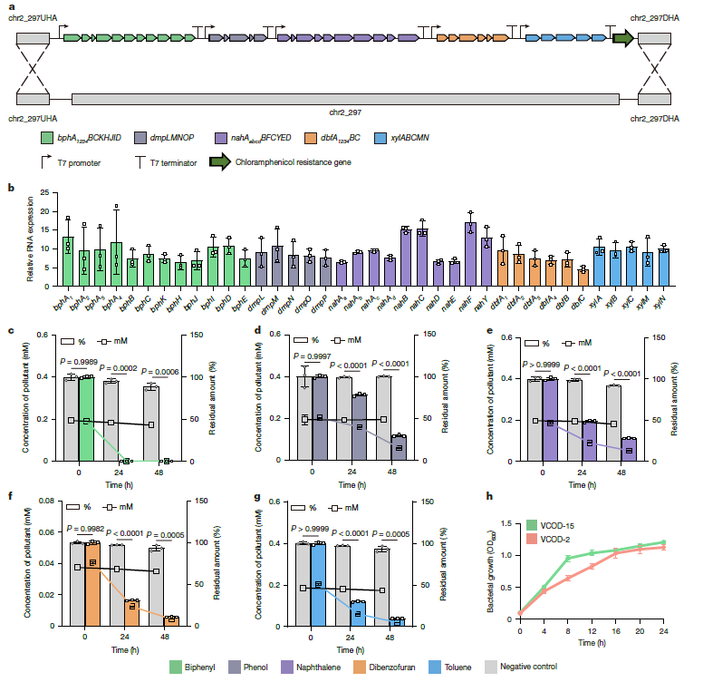 图4、通过VCOD-15和基因表达水平检查复杂有机污染物的修复。a,插入VCOD-15染色体的基因簇的示意图(VmaxΔint::tfoXΔchr2_297::bphA1234BCKHJID::dmpLMNOP:nahAabcdBFCYED::dbfA1234BC::xylABCMN)。将五个基因簇(bph、dmp、no、dbf和xyl)依次插入中性位点chr2_297。氯霉素抗性基因CmR显示为深绿色箭头。连接基因簇的长度为43 kb。b,对工程V中复杂污染物降解基(c,联苯;d,苯酚;e,萘;f,DBF;g,甲苯)。彩色(VCOD-15)和灰色(Vmax)点反映污染物浓度(左y轴)。彩色(VCOD-15)和灰色(Vmax)条形表示污染物的残留数量(右y轴)。h,菌株VCOD-2和VCOD-15在LB3培养基中的生长测量为OD600。