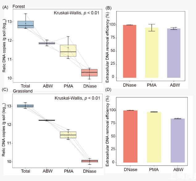 图6.基于不同核酸提取方法的标签胞外DNA拷贝数和去除效率(A)森林生态系统中不同核酸提取方法下标签胞外DNA的拷贝数;(B)森林生态系统中不同核酸提取方法下标签胞外DNA的去除率;(C)草原生态系统中不同核试验提取方法下标签胞外DNA的拷贝数;(D)草原生态系统中不同核酸提取方法下标签胞外DNA的去除率。Total:总DNA提取;DNase:DNase预消化;ABW:碱性缓冲液洗涤;PMA:叠氮溴化丙锭(PMA)处理。