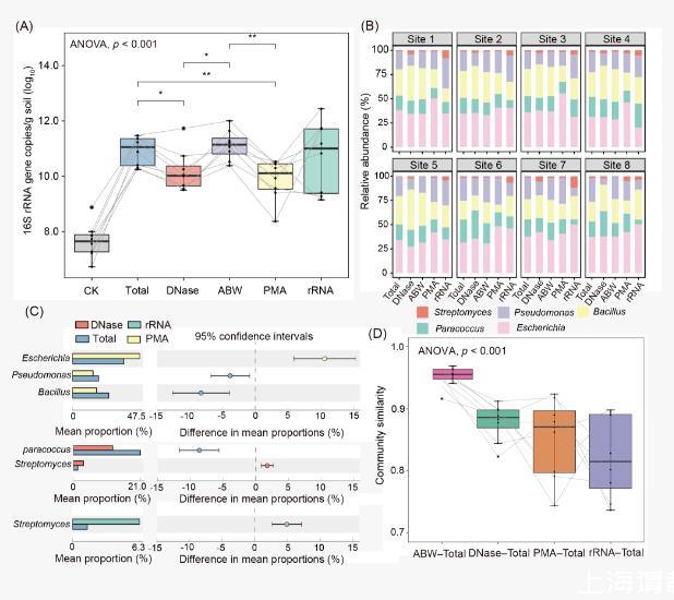 图5.不同核酸提取方法所表征的模拟微生物类群的多度和群落结构(A)土壤16S rRNA基因拷贝数;(B)模拟土壤微生物群落的结构;(C)总微生物和活体微生物类群的相对多度差异,差异通过t检验揭示;(D)总DNA提取和不同土壤活体微生物研究方法所表征模拟群落结构的相似性。Total:总DNA提取;DNase:DNase预消化;ABW:碱性缓冲液洗涤;PMA:叠氮溴化丙锭(PMA)处理;rRNA:rRNA直接表征。