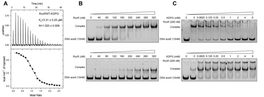 图3、评估KDPG对RccR的影响。(A)RccR与KDPG结合的ITC测定。Kd,解离常数;N,每个RccR的结合位点数。在不存在(B)或存在(C)0.0625,0.125,0.25,0.5,1,2,4和8 mM KDPG的情况下,RccR与其操纵子DNA相互作用的EMSA分析。