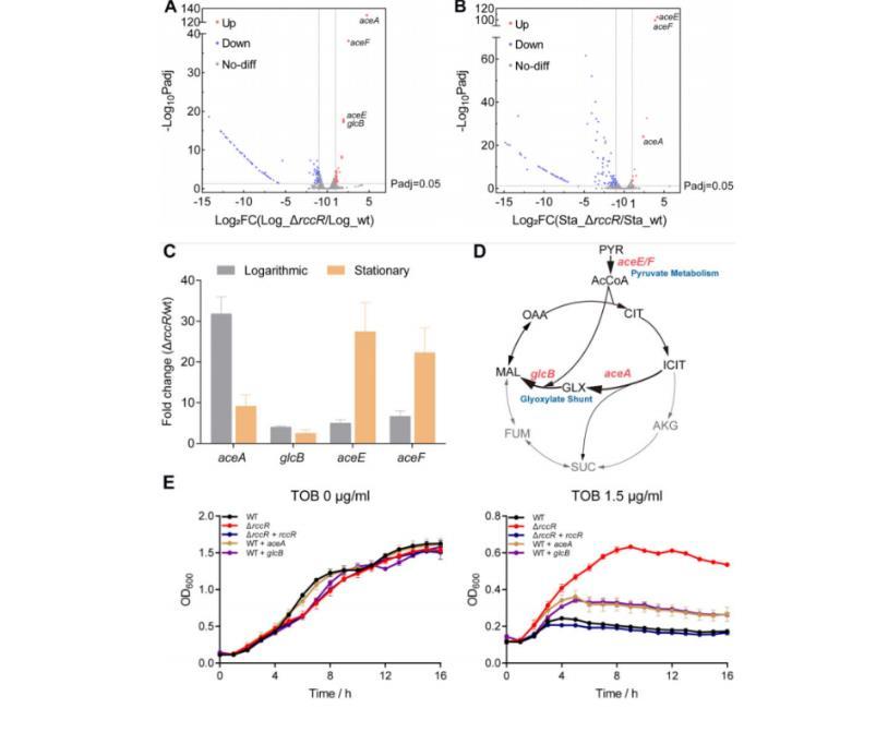 图2、RccR是丙酮酸代谢和乙醛酸分流途径的调节因子。PAO1野生型和ΔrccR缺失突变体在对数期(A)和稳定期(B)基因表达显著性差异分析的火山图。红色圆圈表示表达上调,蓝色圆圈表示表达下调,灰色圆圈表示无显著差异。(C)野生型PAO1和ΔrccR缺失突变体在对数期和稳定期aceE,aceF,aceAaceE,aceF,aceA和glcBglcB的相对mRNA转录水平。PAO1的gyrBgyrB基因用作参考基因。数据表示为平均值±SD(n=3)。(D)丙酮酸代谢和乙醛酸分流途径中受RccR调控的基因。(E)过表达aceAaceA或glcBglcB基因的PAO1菌株的生长曲线测定。菌株在存在或不存在妥布霉素的LB培养基中生长。