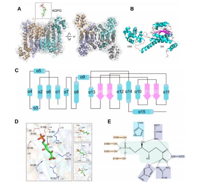 图4、RccR/KDPG复合物的结构表征。(A)RccR/KDPG复合物四聚体形式的整体结构以及KDPG电子密度的详细视图。单体(A–D)分别用小麦色、浅蓝色、蓝绿色和灰色标记。KDPG为绿色。(B)RccR单体结构的卡通图。α-螺旋、β-折叠和环分别用青色、洋红色和粉红色着色。(C)基于RccR/KDPG三级结构的RccR拓扑示意图。(D,E)RccR与KDPG之间详细的直接氢键相互作用。虚线代表直接氢键。位于同一单体的残基用相同颜色标记。