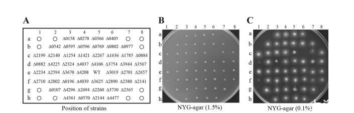 在丰富NYG平板(1.5%琼脂)和半固体NYG平板(0.1%琼脂)上分别观察了HK基因突变体的菌落形态和游动性(图2),并测量了所有突变体在NYG培养基中的生长曲线(见补充材料中的图S2)。五个基因(Smlt0769,Smlt0882,Smlt0977,Smlt1636,和Smlt1785)的突变体比野生型菌株或其他突变体生长显著缓慢(见补充材料中的图S2)。Smlt0882是肠杆菌荚膜合成中RcsC的直系同源物。RcsC HK调节细菌包膜应激反应,其突变通常影响细胞包膜完整性。Smlt1636在其他细菌中的直系同源物尚未被研究。然而,这两个基因(Smlt0882和Smlt1636)的失活也降低了细菌的游动能力(图2C),这可能是由它们缓慢的生长速率引起的。图2C和补充材料中的表S1显示,除了这两个基因突变体外,还有其他七个突变体也表现出游动能力下降;它们是Smlt1785、Smlt2260(cheA)、Smlt2267(cheA2)、Smlt2324(ravS)、Smlt2380、Smlt2710和Smlt3944突变体。在这些基因产物中,Smlt2260和Smlt2267分别是大肠杆菌生物传感器CheA和CheA2的直系同源物,表明它们参与趋化性调节。Smlt2324(RavS)、Smlt2380、Smlt2710和Smlt3944是含有PAS结构域的HKs,负责检测氧气、氧化还原电位或光,从而表明这些信号对嗜麦芽窄食单胞菌的游动性至关重要。