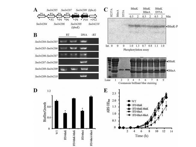 Smlt4209-Smlt4208是一个控制生物膜形成的TCS。我们接下来专注于进一步研究Smlt4208,因为其突变体稳定地损害了生物膜形成而不影响生长。此外,之前没有研究过该HK基因的其他直系同源物。如图4A所示,Smlt4208位于一个基因组位点,该位点包含一个RR基因(Smlt4209)、一个编码推定的MarR家族转录因子的基因(Smlt4207)和几个功能未知的基因。我们使用不同算法进行的操纵子预测存在争议:ProOpDB预测Smlt4205-Smlt4209形成一个包含五个基因的操纵子,从Smlt4205到Smlt4209,而DOOR数据库的理论预测和MicrobesOnline操纵子预测工具都提出一个仅包含Smlt4208和Smlt4209的操纵子。为了通过实验解读该位点的潜在操纵子结构,设计了一系列引物,并使用RT-PCR检查这些基因之间的基因间转录。RT-PCR分析显示,Smlt4208和Smlt4209确实构成一个双顺反子操纵子,因为我们观察到两个基因之间PCR产物的扩增,这表明它们形成一个转录单元并构成一个完整的TCS(图4B)。然而,该分析未能检测到Smlt4207和Smlt4208之间的转录,表明Smlt4207是基因组中的一个独立转录单位。这一实验结果因此支持了DOOR数据库和MicrobesOnline操纵子预测工具的理论预测。因此,我们将该TCS命名为BfmA(Smlt4209)-BfmK(Smlt4208)。