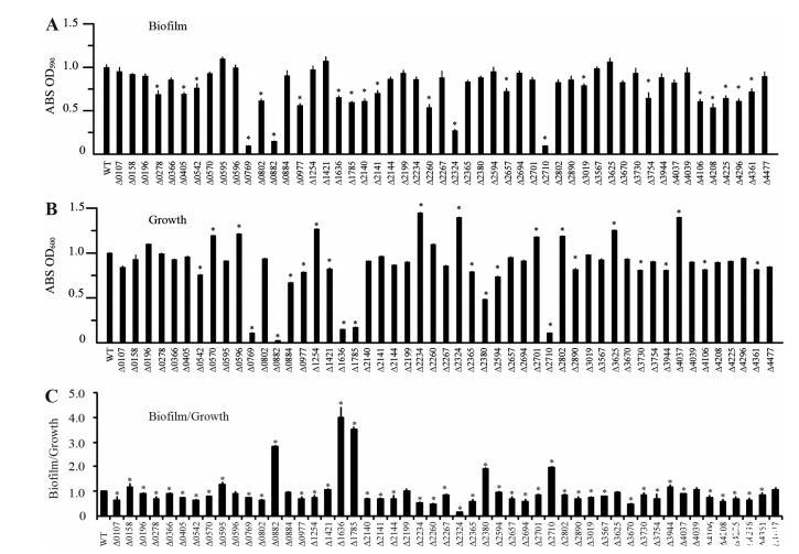 九个突变体(ΔSmlt0158,ΔSmlt0595,ΔSmlt0882,ΔSmlt1421,ΔSmlt1636,ΔSmlt1785,ΔSmlt2380,ΔSmlt2710,和ΔSmlt3944)的生物膜与生长比率显著增加,而其他38个突变体的比率降低。特别值得注意的是,Smlt4208(命名为BfmK)的插入失活导致生物膜显著减少,这在我们之前使用随机、大规模转座子突变的研究中也观察到。有趣的是,虽然rpfC直系同源物(Smlt2234)的插入失活导致生物膜与生长比率显著降低(图3C),但其不考虑生长的生物膜量并未减少(图3A)。这与黄单胞菌属成员的情况截然不同,后者的rpfC基因突变已被证明会导致细胞间通讯和生物膜形成的明显缺陷。
