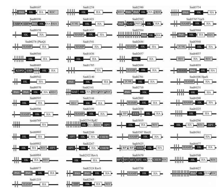 与嗜麦芽窄食单胞菌近缘的黄单胞菌属成员的HK基因比较显示,黄单胞菌属中与毒力相关的HKs的所有直系同源物,包括RpfC(Smlt2234)、VgrS(或ColS,Smlt3765)、PhoQ(Smlt0278)、RavS(Smlt2324)、RavA(Smlt2322)、RaxH(Smlt3567)和HpaS(Smlt4106),也存在于嗜麦芽窄食单胞菌K279a中(图1)。由于嗜麦芽窄食单胞菌不是植物病原体,这些与毒力相关的HKs在两个细菌类群(窄食单胞菌属和黄单胞菌属)之间的信号检测方面可能表现出细微的功能分化。这些HK基因中的大多数(56个基因)在基因组附近至少含有一个RR基因。例外是Smlt0107、Smlt0570、Smlt3019、Smlt3625、Smlt3730和Smlt4540;这六个HKs是孤儿,其同源RRs可能缺失或位于其他基因组位点上。