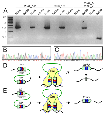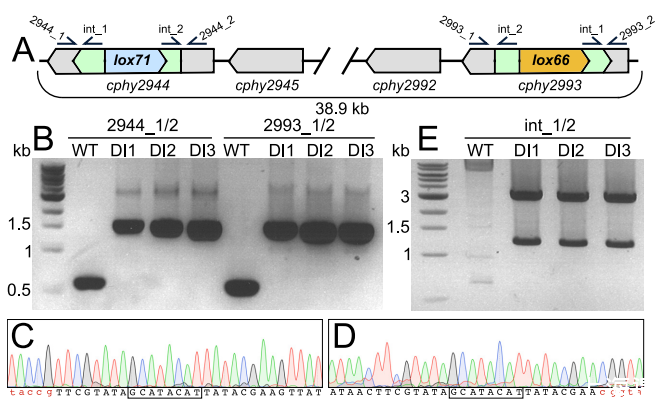 图3、Cre介导的基因组缺失。(A)PCR检测cphy2944(引物2944_1/2)、cphy2993(引物2993_1/2)及38.9 kb区域(引物2944_1/2993_2),比较pQcre1转化前(DI-SS、DI-AS)与转化后(Del-SS、Del-AS)。(B-C)Del-AS中内含子片段(B)和Del-SS中lox72位点(C)的DNA测序色谱图,红色标出回文位置或中央间隔。(D-E)Cre介导lox71与lox66之间基因组缺失模型:Del-AS株为双向内含子重组成28-bp内含子片段(无lox72),Del-SS株为单向内含子(含lox72)。
