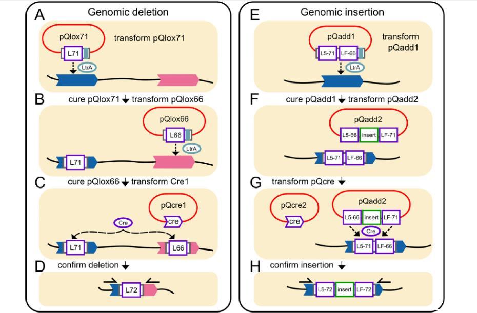 图1、C.phytofermentans基因组缺失与插入概览.(A)pQlox71引入,通过targetron编码的LtrA蛋白在基因组中插入lox71(L71)位点。(B)pQlox71清除后,引入pQlox66,在基因组中插入lox66(L66)位点。(C)pQlox66清除后,引入pQcre1,Cre介导重组删除lox66与lox71位点间的序列。(D)通过PCR确认缺失和lox72位点(箭头表示引物位置)。(E)引入pQadd1,将lox511/71(L5-71)和loxFAS/66(LF-66)盒送入基因组。(F)pQadd1清除后,引入pQadd2,携带目标插入序列,位于lox511/66(L5-66)和loxFAS/71(LF-71)位点之间。(G)引入pQcre2,实现Cre介导的RMCE。(H)得到的株基因组中插入序列被lox511/72(L5-72)和loxFAS/72(LF-72)夹持,通过PCR确认(箭头表示引物)。