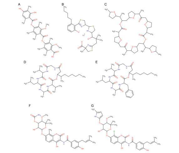 图2.文中讨论的化合物的化学结构:(A)thielavin B;(B)micacocidin B;(C)IKD-8344;(D)CL0231;(E)CL0236;(F)新生霉素;和(G)氯新生霉素。结构使用Marvin Sketch v.14.12.8绘制。
