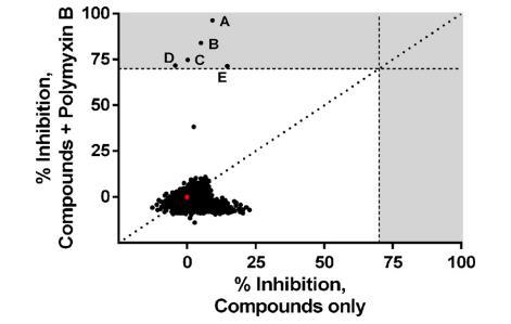 图1.从2686种化合物库中,5种化合物显示出与500μg/mL多粘菌素B(PMB)对洋葱伯克霍尔德菌K56-2的协同效应。结果以化合物存在下的生长抑制百分比表示,相对于无化合物时(无论是单独使用,x轴)或与PMB组合使用(y轴)。黑点代表每种化合物。红点代表所有未添加库化合物的孔的结果(每板一孔)。被认为单独显著抑制或与PMB协同的化合物必须抑制生长≥70%(虚线表示,阴影区域代表更高抑制水平)。点线斜率为1并通过原点;仅用于说明目的。左上象限的点代表在测试浓度下不直接抑制洋葱伯克霍尔德菌生长但与PMB协同的化合物。右下象限的点代表抑制洋葱伯克霍尔德菌但被PMB拮抗的化合物。右上象限靠近线的点代表抑制洋葱伯克霍尔德菌但不增加或减少PMB效应的化合物。化合物为(A)IKD-8344、(B)新生霉素、(C)CL0231、(D)micacocidin B和(E)thielavin B。