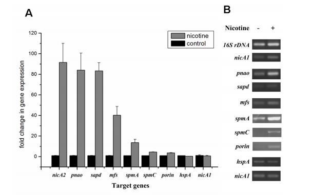 为了验证蛋白质组数据并评估与尼古丁降解相关或推测相关的基因的相对转录水平,我们利用RT-PCR和RT-qPCR比较了有或无尼古丁诱导下,恶臭假单胞菌S16中基因nicA2、pnao、sapd、mfs、spmA、spmC、porin、nicA1和hspA(推测与尼古丁降解相关)的mRNA水平(图4)。RT-qPCR分析显示,所有靶基因在尼古丁诱导的恶臭假单胞菌S16中似乎都上调。相对于非尼古丁诱导,在尼古丁诱导的恶臭假单胞菌S16中,与尼古丁降解途径相关的基因的mRNA表达量高出18.8至90.3倍,其中nicA2的mRNA上调90.3倍是所测试基因中mRNA水平差异最大的。spmA和spmC的mRNA也分别上调了13.6倍和4.5倍(图4A)。使用半定量RT-PCR也观察到类似的结果,这些基因中的每一个在尼古丁暴露后都被诱导,表明它们在S16菌株的尼古丁降解中起作用(图4B)。总体而言,这些数据表明通过RT-qPCR确定的mRNA水平与通过2D LC-MS/MS测量的蛋白质水平一致,并且差异表达的蛋白质在转录水平上受到调控。