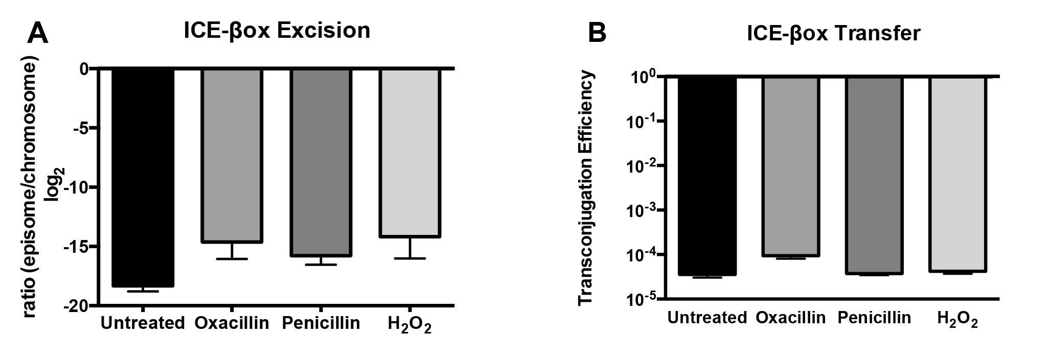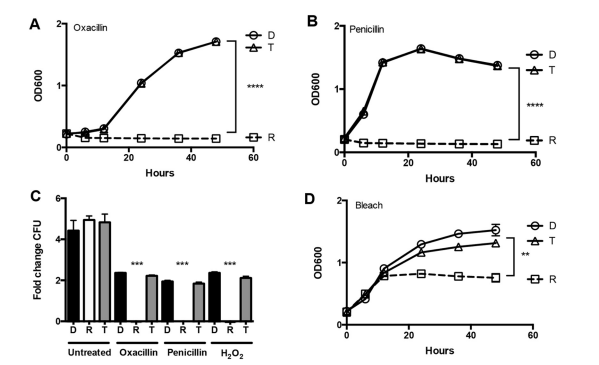 图2、ICE-ox促进氧化应激下生存。(AB)ICE-ox增强对氧氯西林和青霉素耐受。E期ICE-ox供体(D,圆圈)、受体(R,方块)、转受体(T,三角)暴露于100μg/ml氧氯西林(A)或2μg/ml青霉素G(B),用Bioscreen生长曲线分析仪测定OD600。(C)ICE-ox增强对氧氯西林、青霉素和H2O2的耐受性。E期细胞暴露6小时后,计算(CFU处理/CFU未处理)平均±SEM。(D)ICE-ox提高对漂白剂耐受性。E期菌株在0.5 ppm漂白剂中培养,用Bioscreen测定OD600。