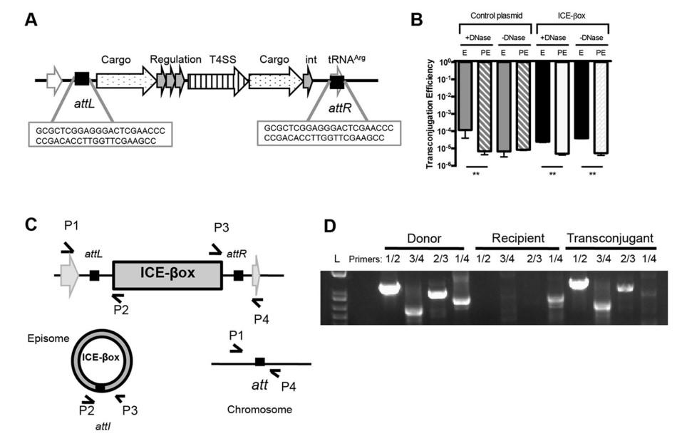图1、ICE-ox是可移动遗传元件。(A)ICE-ox示意图。65 kb基因座预测包含38个货物基因(实心箭头)、4个调控基因(灰色箭头)、18个IV型分泌系统(T4SS;条纹箭头)基因。ICE-ox两侧为43 bp直接重复序列,推测作为整合位点(attL和attR)。示意图非按比例绘制。(B)E期和PE期细胞介导的ICE-ox转移对DNase I耐受。在选择性培养基上接种可鉴定质粒或ICE-ox转受体。共轭效率(平均±SEM)为每个供体细胞对应的ICE-ox阳性JR32受体细胞数。E期供体的共轭效率显著高于PE期,Student t检验,**P<0.01。(C)ICE-ox切除实验示意。引物组P1/P2和P3/P4分别扩增attL和attR连接片段,P2/P3扩增切除的ICE-ox产物(attI),P1/P4扩增切除后染色体残留的结合位点(att)。(D)PCR检测环化ICE-ox。利用A板描述的PCR方法,用Lp02供体(MB1353)、受体(JR32,MB1354)和转受体(JR32+ICE-ox,MB1354)的基因组DNA,检测整合(attL和attR)和切除(attI)形式的连接片段,以及切除后残留位点(att)。