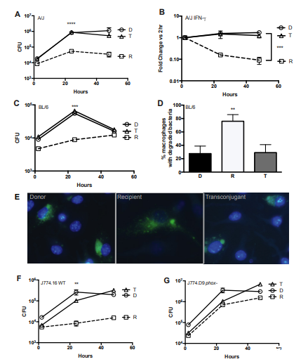 图3、ICE-ox在耐受巨噬细胞中提供保护。(A)ICE-ox提高A/J巨噬细胞中适应性。MOI=1感染,计算平均CFU±SEM,三重复样本,代表三次独立实验。t检验显示ICE-ox携带与否差异显著(****P<0.001)。(B)ICE-ox提高激活A/J巨噬细胞中细菌持续性。用100 U IFN-γ激活巨噬细胞,MOI=1感染。显示CFU相对2小时的倍数变化(平均±SEM)。t检验显示差异显著(***P<0.005)。(C)ICE-ox提高C57BL/6(BL/6)巨噬细胞中持续性。骨髓衍生巨噬细胞感染后计算CFU±SEM,t检验显示差异显著(***P<0.005)。(D、E)ICE-ox保护细菌免受BL/6巨噬细胞降解。24小时后,用L.pneumophila特异性抗体(绿色)和DAPI(蓝色)染色观察。显示含降解细菌巨噬细胞百分比±SEM,t检验差异显著(**P<0.01)。(F、G)ICE-ox保护作用依赖NADPH氧化酶。WT(F)或NADPH氧化酶缺失(G)J774细胞MOI=1感染,计算平均CFU±SEM,t检验显示WT巨噬细胞中差异显著。
