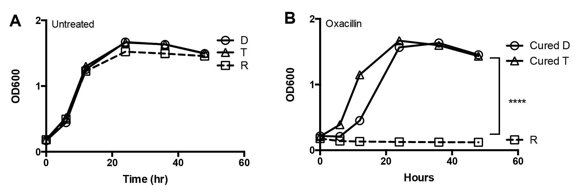 图4、控制增长曲线实验。(A)在标准培养基中,ICE-βox不影响应变生长。在所有生长曲线实验中,AYE的生长被用作菌株存活能力的对照。供体(D)、转结合株(T)和受体株(R)在标准AYE汤中以三倍培养,OD600在生物筛生长曲线分析仪显示的时间点被记录。图中显示±从一个实验中三次重复计算出的SEM平均值,代表了另外三个实验。t检验显示含有或缺乏ICE-βox的菌株间差异具有统计学显著性(****,P<0.001)。(B)ICE-βox独立于氯霉素盒保护菌株免受霉素胁迫。已清除氯安素抗性标记的供体(Cured D,MB1357)和转接株(Cured T,MB1358)和受体(R)株暴露于25μg/ml,并在所示时间内,其生长通过生物筛生长曲线分析仪在600 nm处以光学密度量化。图中显示±从一个实验中三倍样本计算出的SEM平均值,代表了另外三个实验。