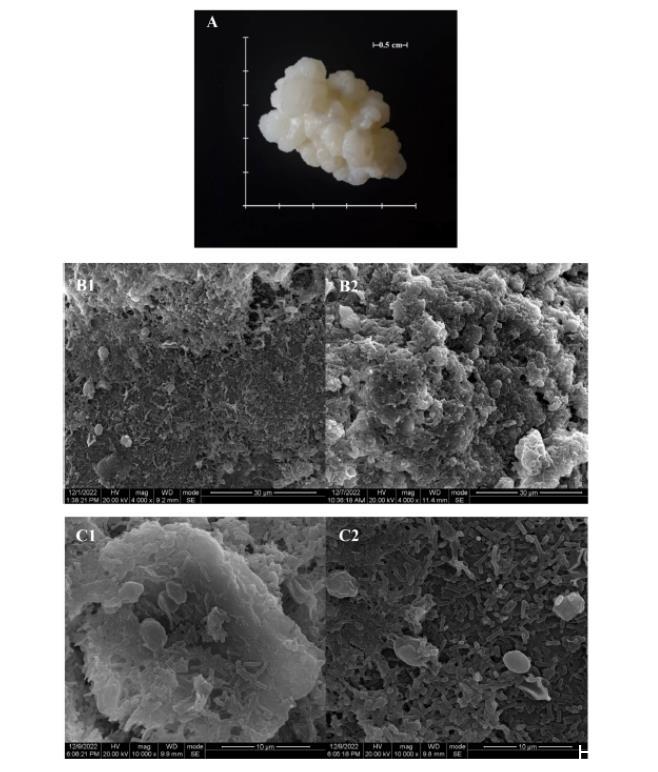 图2、TKG-Y的宏观与微观形态。图2A:TKG-Y的宏观形态呈白色不规则颗粒状,具有弹性且中心有可见空隙。图2B与2C:扫描电镜(SEM)图像显示TKG-Y表面呈多孔网状结构(B),酵母菌主要分布在外层(C),内部微生物密度较低。