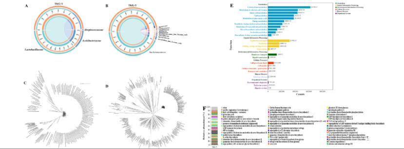 图1、TKG-Y开菲尔粒的微生物组成分析。图1A与B:通过环形图展示TKG-Y中细菌(A)和真菌(B)的群落结构。细菌以乳杆菌科(Lactobacillaceae,73.76%)和醋酸杆菌科(Acetobacteraceae,25.61%)为主,真菌以酵母菌科(Saccharomycetaceae,91.87%)占绝对优势。图1C与1D:基于邻接法构建的系统发育树,显示所有操作分类单元(OTUs)的进化关系,进一步验证物种分类的准确性。图1E与1F:通过KEGG通路和FUNGuild功能预测,分析微生物群落的代谢功能。细菌功能主要集中在代谢、遗传信息处理等途径,而真菌主要参与碳水化合物代谢和脂肪酸延伸等过程。