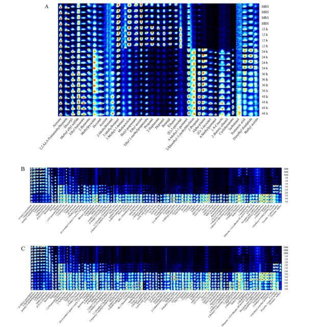 图5、发酵乳风味物质的GC-IMS分析。图5A:动态监测KYS-164发酵乳中挥发性成分的变化。发酵48小时后,醛类(如庚醛)、酯类(如乙酸苯乙酯)和醇类等物质显著增加,赋予产品花香、果香和坚果香。图5B:GC-IMS二维谱图对比KYS-164发酵乳与TKG-Y发酵乳的风味差异。KYS-164单独发酵能更快产生丰富风味,而TKG-Y需更长时间。图5C:指纹图谱显示,发酵3天是风味形成的最佳阶段,第4天部分风味物质(如4-甲基酚)开始衰减。