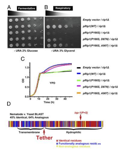 图5. 拴系突变挽救酿酒酵母Rip1(P166S)的呼吸缺陷。将缺失整个RIP1基因开放阅读框(rip1△)的酵母细胞分别转化含空载体质粒、表达野生型Rip1(WT)、Rip1(P166S)、D87N(Sea1)修饰的Rip1(P166S)或A90T(Sea4)修饰的Rip1(P166S)的质粒。表达Rip1(P166S)的酵母呼吸生长能力显著受损,而拴系区域内的二次突变D87N或A90T可挽救此缺陷。(A和B)在含2%(质量/体积)葡萄糖(发酵条件;A)或3%(质量/体积)甘油(呼吸条件;B)的固体合成培养基上评估生长情况。(C)通过Bioscreen液体培养实验在含2%(质量/体积)葡萄糖的富培养基中生成生长曲线。(D)Rip1与isp-1保守性对比。