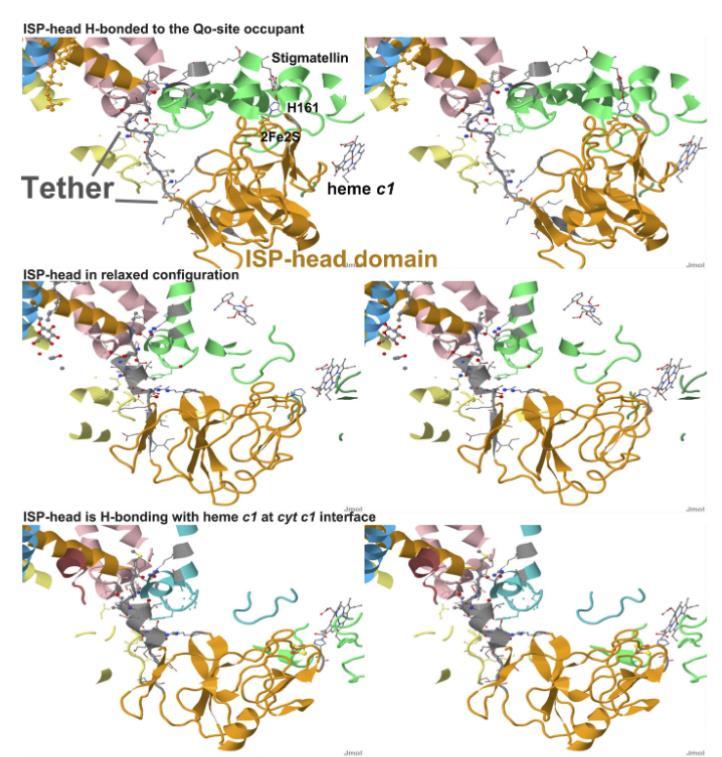 当H161与Qo位点占据物形成氢键时(上图),系链因外力作用(主要来自与占据物的氢键强度)而被拉伸,导致系链延长并旋转头部。螺旋区域被拉伸至伸展构象,从而导致多个跨跨间氢键断裂。当H161与血红素c1形成氢键时,位移幅度显著减小,系链区域仍保持与松弛态相似的氢键构型。SI附录图S6和表S6详细展示了Qo位点对接(耻垢素)与松弛构象(唑氧菌素)之间氢键变化的细节。链的颜色标注如下:链c(细胞色素b)为粉色;链d(细胞色素c1)为黄色;链e(ISP)为橙色;链j(7.2-kDa蛋白)为青色;链p(细胞色素b)为绿色(或在1BE3中为蓝绿色);链q(细胞色素c1)为橄榄绿(或在1BE3中为浅绿色)。灰色区域的卡通颜色由 CPK 的C原子或C-C键着色。邻近链7埃范围内的原子显示为半径0.2埃的填充球体,3.5埃范围内的原子显示为半径0.4埃的填充球体。选定原子按原子类型 CPK 着色。三个结构均以相同取向展示蛋白质支架,因此主要差异源于ISP锚定链和外在结构域的构象变化。交叉眼视立体图像