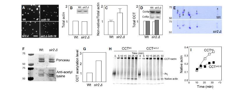 图3、Sir2p缺失细胞天然肌动蛋白减少且CCT活性降低(A)随机孢子分析显示SIR2与CCT(cct6-18)在30°C下的遗传互作。比例尺=4mm。(B)Western blot显示sir2Δ与野生型细胞总肌动蛋白量无差异。(C)DNaseI结合实验表明sir2Δ细胞中非天然肌动蛋白比例增加。(D)CCT亚基(Cct4p、Cct5p)水平在sir2Δ中正常。(E)等电聚焦电泳显示CCT亚基组成无变化。(F)sir2Δ细胞中CCT乙酰化水平升高(上:蛋白负载对照,下:抗乙酰化赖氨酸信号)。(G)抗乙酰化赖氨酸信号量化结果。(H-I)sir2Δ来源的CCT折叠活性降低。放射性标记的β-肌动蛋白与纯化CCT孵育后,通过天然电泳分析折叠效率(I为天然肌动蛋白生成量)。