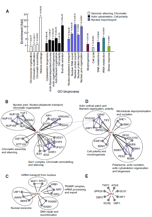 图1、SIR2遗传互作网络的功能富集分析。(A)通过超几何分布分析(p<0.01),确认的SIR2合成致病相互作用在基因本体生物过程组中显著富集,主要涉及染色质沉默、核质运输和肌动蛋白细胞骨架功能。(B-E)基于已知物理相互作用(蓝色边)将SIR2互作基因分组显示。黑色边表示本研究发现的SIR2与复合物间的遗传相互作用。