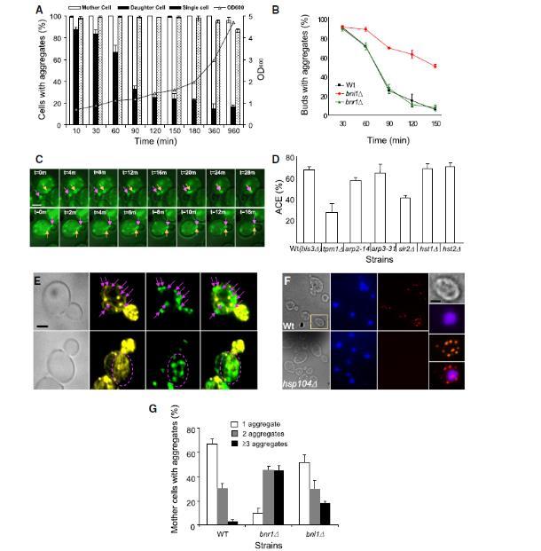 图5、子细胞通过逆向运输在胞质分裂过程中清除蛋白质聚集体。(A)38°C热激16小时后,子细胞聚集体随时间消失,但游离单细胞中重新出现。(B)极性体形成素Bni1p(非Bnr1p)为子细胞清除聚集体所必需。(C)实时成像显示子细胞聚集体向母细胞逆向移动(粉箭头)并与母细胞聚集体(黄箭头)融合。比例尺=2μm。(D)TPM1突变(非ARP2/ARP3)或SIR2缺失会降低逆向清除效率。(E)Hsp104p聚集体定位于肌动蛋白缆富集区(紫箭头)。比例尺=2μm。(F)邻近连接实验检测Hsp104p与肌动蛋白的互作。比例尺=2μm。(G)bnr1Δ突变体减少母细胞内核聚体的融合。