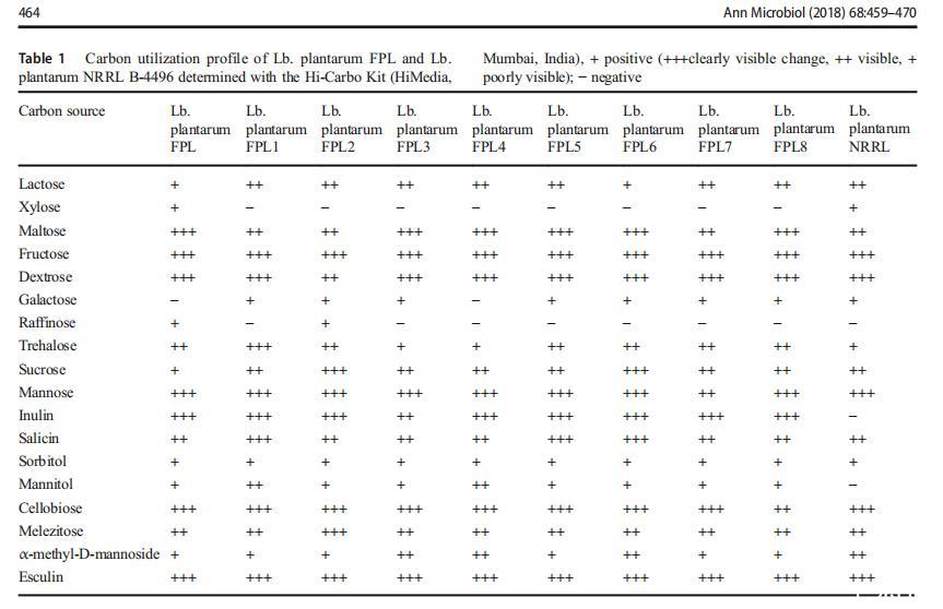 API ZYM的结果揭示了酯酶(C4)、酯酶脂肪酶(C8)、脂肪酶(C14)、亮氨酸芳胺酶、缬氨酸芳胺酶、胱氨酸芳胺酶、酸性磷酸酶、萘酚-AS-BI-磷酸水解酶、β-半乳糖苷酶、α-葡萄糖苷酶、β-葡萄糖苷酶和N-乙酰-β-氨基葡萄糖苷酶的产生。这些菌株没有碱性磷酸酶、胰蛋白酶、α-糜蛋白酶、α-半乳糖苷酶、β-葡萄糖醛酸酶、α-甘露糖苷酶和α-岩藻糖苷酶的活性。Siezen等人进行的研究测试了185株植物乳杆菌的碳水化合物利用;所有菌株都降解海藻糖、蔗糖、松三糖(除一株外)和山梨糖醇,与植物乳杆菌FPL菌株相似。在甘露醇和菊粉的情况下存在差异;本研究表明,只有植物乳杆菌FPL菌株利用这些碳水化合物,这些碳水化合物通常出现在植物环境中。