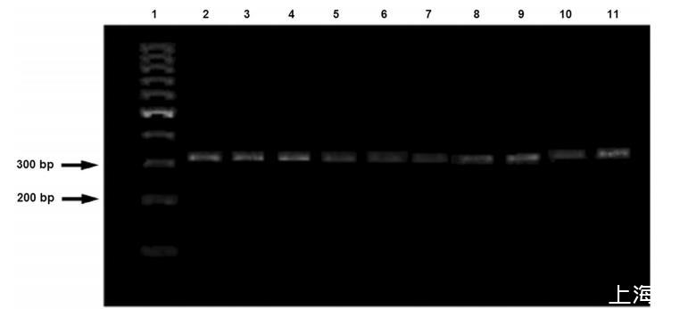 图1多重PCR检测扩增产物结果。第1泳道为1 kb Ladder Perfect Plus分子量标准(Eurx公司,波兰格但斯克)。第2泳道显示植物乳杆菌FPL株的扩增产物,长度为295.53 bp;第3泳道为植物乳杆菌FPL1株的扩增产物,长度295.56 bp;第4泳道为植物乳杆菌FPL2株(295.6 bp);第5泳道为植物乳杆菌FPL3株(298 bp);第6泳道为植物乳杆菌;$FPL4 298.5;第7行植物乳杆菌FPL5 294 bp;第8行植物乳杆菌$FPL6 296 bp;第9行植物乳杆菌FPL7 299 bp;第10行植物乳杆菌FPL8 308 bp;第11行植物乳杆菌FPL9 310 bp。碱基对长度/数量通过Quantity One软件(美国伊利诺伊州Bio-Rad公司)测定。