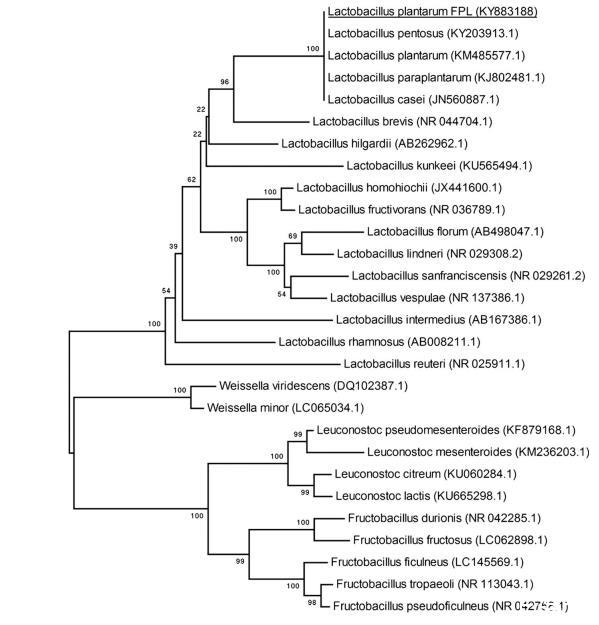 植物乳杆菌FPL 16S rRNA基因的GeneBank登录号:KY883188。由于获得的16S rRNA基因序列相同,仅包含该组的一个代表。