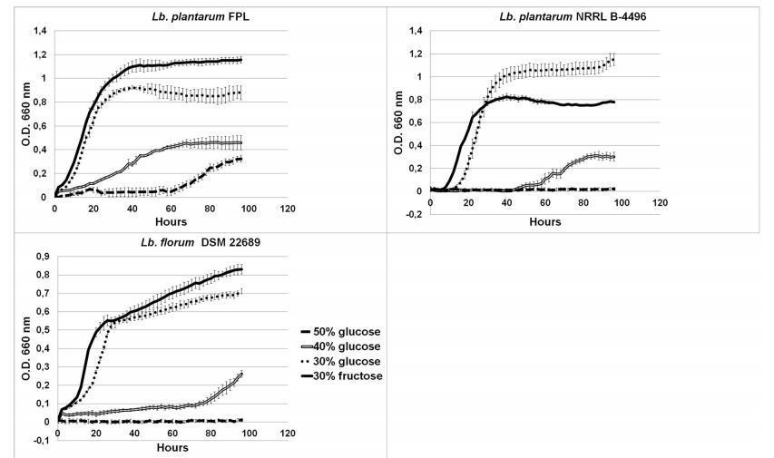 尽管菌株NRRL B-4496在果糖上生长,但它不能在含有高浓度葡萄糖和果糖的培养基上生长。参考菌株没有发展出能够在富含糖的环境中生存的机制。已描述的FLAB的生长曲线与植物乳杆菌FPL相比更低。本文进行的实验表明,MALDI-TOF和Bioscreen C有助于快速筛选嗜果糖乳酸菌。