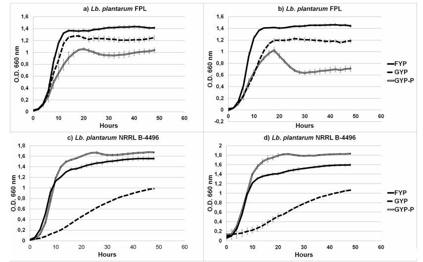 图3植物乳杆菌FPL在(a)有氧条件、(b)无氧条件及植物乳杆菌NRRL B-4496在(c)有氧条件、(d)无氧条件下不同碳源(FYP、GYP、GYP-P)中的生长曲线