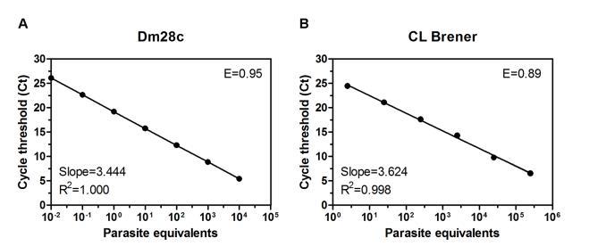 正如预期的那样,即使在存在ssDNA作为DNA载体的条件下,不同肠道样品的DNA回收率也高度可变,需要异源内标来对每个样品提取的DNA回收率进行归一化。我们首先评估了使用连续稀释的质粒(含有ble抗性基因)掺入肝素化兔血中,与纯化的克氏锥虫DNA靶向重复卫星序列相比,内标PCR扩增的效率。获得了两种扩增子的高度相似的扩增效率百分比(卫星DNA的E=0.95 vs.ble的E=0.96),从而验证了qPCR中使用内标的有效性。因此,通过连续稀释来自Dm28c(TcI)和CL Brener(TcVI)参考库的纯化DNA,在通过掺入血液裂解物的质粒DNA归一化后,确定了基于克氏锥虫卫星DNA的qPCR的灵敏度。qPCR对CL Brener和Dm28c品系的检测限分别为1和0.01寄生虫当量(循环阈值(Ct)数约为25)。低于0.01的寄生虫浓度仍可检测到,但Ct值较高(约30),接近检测限背景。CL Brener和Dm28c品系的动态范围、扩增效率和R2值(决定系数)分别为0.01-10^4和1-10^5寄生虫当量、89%和95%以及0.998和1.000。为了确定从整个肠道匀浆物中分离出的某些PCR抑制剂痕迹是否能够影响PCR效率和灵敏度,我们通过用组织特异性昆虫匀浆物(进食后一周解剖的整个消化道AM、PM和H)替换血液DNA,对Dm28c进行了qPCR扩增。动态范围、扩增效率和R2值分别为0.001-10^4寄生虫当量、92%和1,与血液DNA提取物提供的结果相似。因此,无论DNA来源如何,都生成了具有相似高灵敏度的标准曲线,验证了qPCR检测的稳健性。