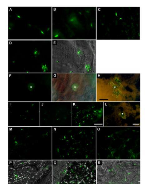 图7. 感染GFP标记寄生虫昆虫消化道荧光显微镜图像。图像显示绿色荧光寄生虫定殖于前肠(AM)(A-H)、中肠(PM)(I-L)和后肠(H)(M-R)。(A-C) 分别为感染后第1、2、7天AM荧光图像,显示自由游动寄生虫。(D-H) 荧光与DIC图像显示感染后第1天(D,E)和第4天(F-H)的寄生虫聚集体。星号指示与肠壁相关的寄生虫聚集体。(I-K) 分别为感染后第1、2、7天PM荧光图像。(L) 感染后第4天荧光图像,星号指示PM管腔内的寄生虫簇。(M-R) 分别为感染后第4(M,P)、7(N,Q)和21(O,R)天H的荧光与DIC图像。比例尺:(A-H) 50μm;(I-K) 50μm;(L) 10μm;(M-R) 50μm。A-E、I-K、M-Q及F-H、L图像分别使用蔡司Axioplan 2荧光显微镜和蔡司Axioplan 2荧光显微镜拍摄。