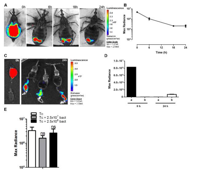 这些数据表明,在我们的实验条件下,肠道微生物群似乎不参与上鞭毛体寄生虫数量的急剧减少。我们研究了使用锥鞭毛体寄生虫(一种被认为更坚固且更能抵抗脊椎动物宿主血液环境的形态,并且对应于自然条件下感染昆虫媒介的阶段)是否可以观察到这种减少。使用在培养物中上鞭毛体和锥鞭毛体均组成型表达荧光素酶(pTREX-Luc整合构建体)的Dm28c品系,我们观察到在两种寄生虫生活史阶段,24小时后发光信号均大幅下降。