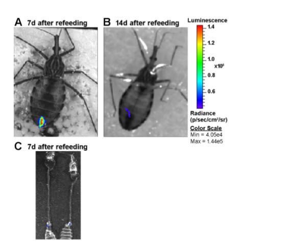 图4. 感染昆虫摄食后的生物发光成像。体内(A、B)与离体(C)成像显示,在再次饲喂后一至两周内,大部分寄生虫仍密集聚集于直肠部位,表现为消化道末端呈现点状发光信号。