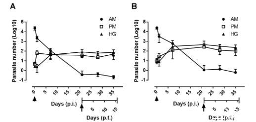 图8. 自然条件下实时监测克氏锥虫在长红锥蝽肠道内的定植过程。追踪感染后(p.i.)和吸血后(p.f.)前中肠(AM)、后中肠(PM)及后肠(H)中上鞭毛体(A)和循环后期锥鞭毛体(B)的寄生虫发育情况。成虫饲喂浓度为10⁷细胞/毫升。箭头符号与箭头分别表示初始感染锥鞭毛体时间及再次吸血时间(感染后21天)。在不同时间点解剖昆虫,分别从各肠段提取总DNA,通过qPCR技术评估寄生虫数量。每个时间点代表一次实验(n=8)。