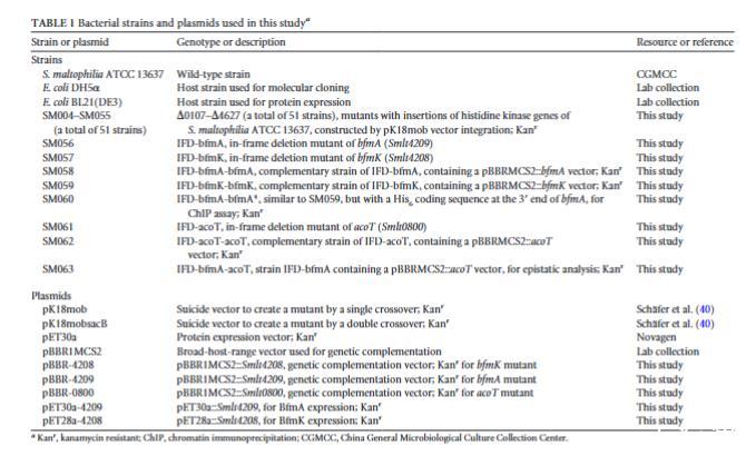 HK基因的系统插入失活和突变体的表型鉴定。为了获得嗜麦芽寡养单胞菌ATCC 13637中HK基因的突变体文库,我们最初旨在构建包含HK基因截短DNA序列(300至450 bp)作为插入片段的重组自杀载体(pK18mob)。在嗜麦芽寡养单胞菌K279a基因组中预测为HK的62个基因中,获得了60个重组载体(见补充材料中的图S1)。两个基因,Smlt1219和Smlt4540,未能通过各种引物进行PCR扩增,表明它们不存在于嗜麦芽寡养单胞菌ATCC 13637基因组中。从这些自杀载体开始,共获得了51个插入突变体,并通过PCR进行了验证(表1)。