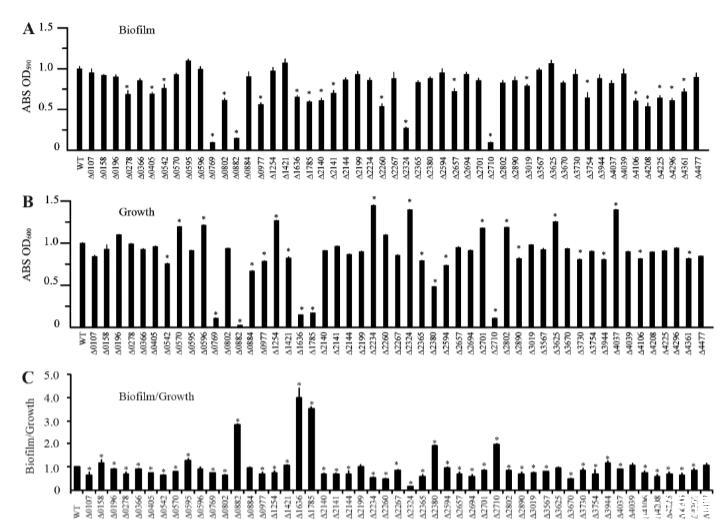 嗜麦芽寡养单胞菌生物膜缺陷突变体的系统筛选。为了研究HK基因突变体的生物膜形成能力,收集在丰富NYG培养基中过夜培养的细菌细胞,进行洗涤,并将各自的浓度调整至OD600为0.4。将等体积的细菌培养物(20微升)接种到96孔板中,每孔含有180微升新鲜NYG培养基。然后将板在28°C孵育5小时,并使用传统的结晶紫染色方法计算生物膜量(图3A)。同时,通过测定每种培养物在OD600的吸光度值来评估孔中的细菌生长(图3B)。为了估计相对于细菌生长的生物膜形成,计算了生物膜量与浮游细菌(OD600)的比率(图3C)。结果显示,一些突变体(ΔSmlt0596,ΔSmlt0884,ΔSmlt3625,和ΔSmlt4477)的生物膜与生长比率与野生型菌株相比没有显著改变。九个突变体(ΔSmlt0158,ΔSmlt0595,ΔSmlt0882,ΔSmlt1421,ΔSmlt1636,ΔSmlt1785,ΔSmlt2380,ΔSmlt2710,和ΔSmlt3944)的生物膜与生长比率显著增加,而其他38个突变体的比率降低。值得注意的是,Smlt2234(rpfC直系同源物)的插入失活导致生物膜与生长比率显著降低(图3C),但无论生长情况如何,其生物膜量并未降低(图3A)。这与黄单胞菌属成员的情况截然不同,后者的rpfC基因突变已被证明会导致细胞间通信和生物膜发育的明显缺陷。