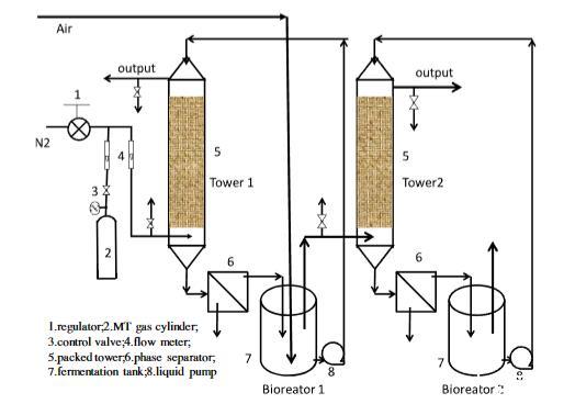 含MT的氮气(模拟沼气)在室温下从第一个塔的底部供应。氮气流速以空床停留时间表示。储存在第一个生物反应器中的生长培养基被循环利用,以滋养固定在火山石上的细胞,并去除第一个塔中产生的硫颗粒和硫酸盐。将空气流鼓入第一个生物反应器,通过液体流动为固定在第一个塔中的细胞提供氧气。来自第一个生物反应器的含MT废气在室温下供应到第二个塔的底部,以去除剩余的MT。储存在第二个生物反应器中的介质被循环利用,为固定在第二个塔中的细胞提供营养。通过将过滤器在LB培养基中浸泡3小时(OD600约为1.0的CZ05肉汤500 mL)来接种两个填充塔。在操作系统中循环3升1号或4号培养基。当火山石上出现细菌菌落时,用3升新鲜培养基完全更换循环培养基。此时,24小时生物膜培养阶段完成。含MT的氮气从第一个填充塔的底部供应。将空气鼓入第一个生物反应器,然后进入第二个塔。通过GC检测两个塔中MT的进出口浓度。