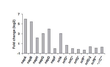 图1 通过微阵列分析显示的MR-1细胞在硝酸盐与富马酸盐培养条件下预测nap和nrf基因的转录水平。所用基因名称基于TIGR注释标准。带单星号标记的基因在最新注释中已更名,带双星号标记的基因已退化。